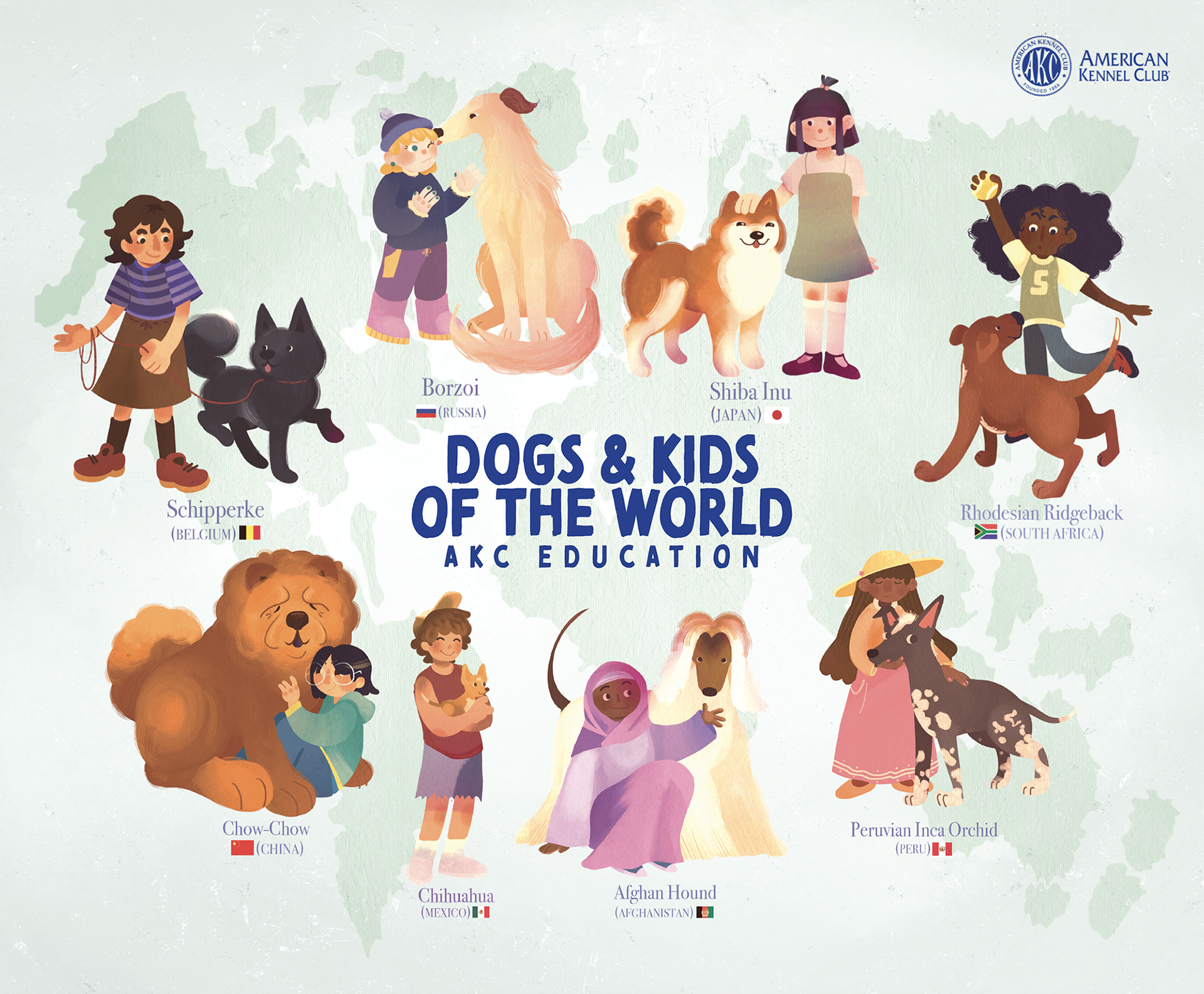 A possible poster for the American Kennel Club illustrating the country of origin for different dog breeds.