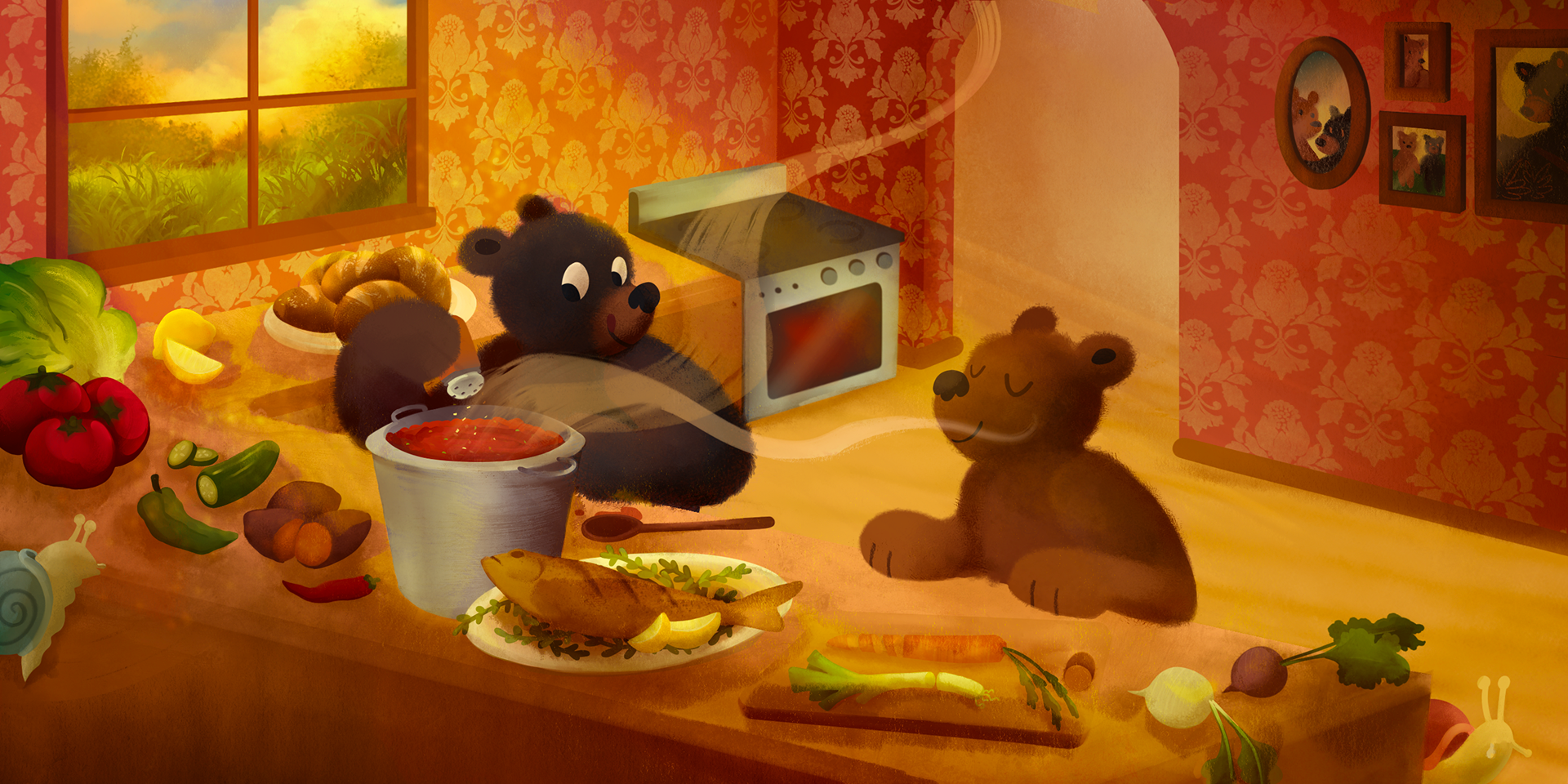 The third illustration for my senior thesis, Bear Hugs, a picture book about the ones we love. This spread conveys the act of cooking for someone as a love language.